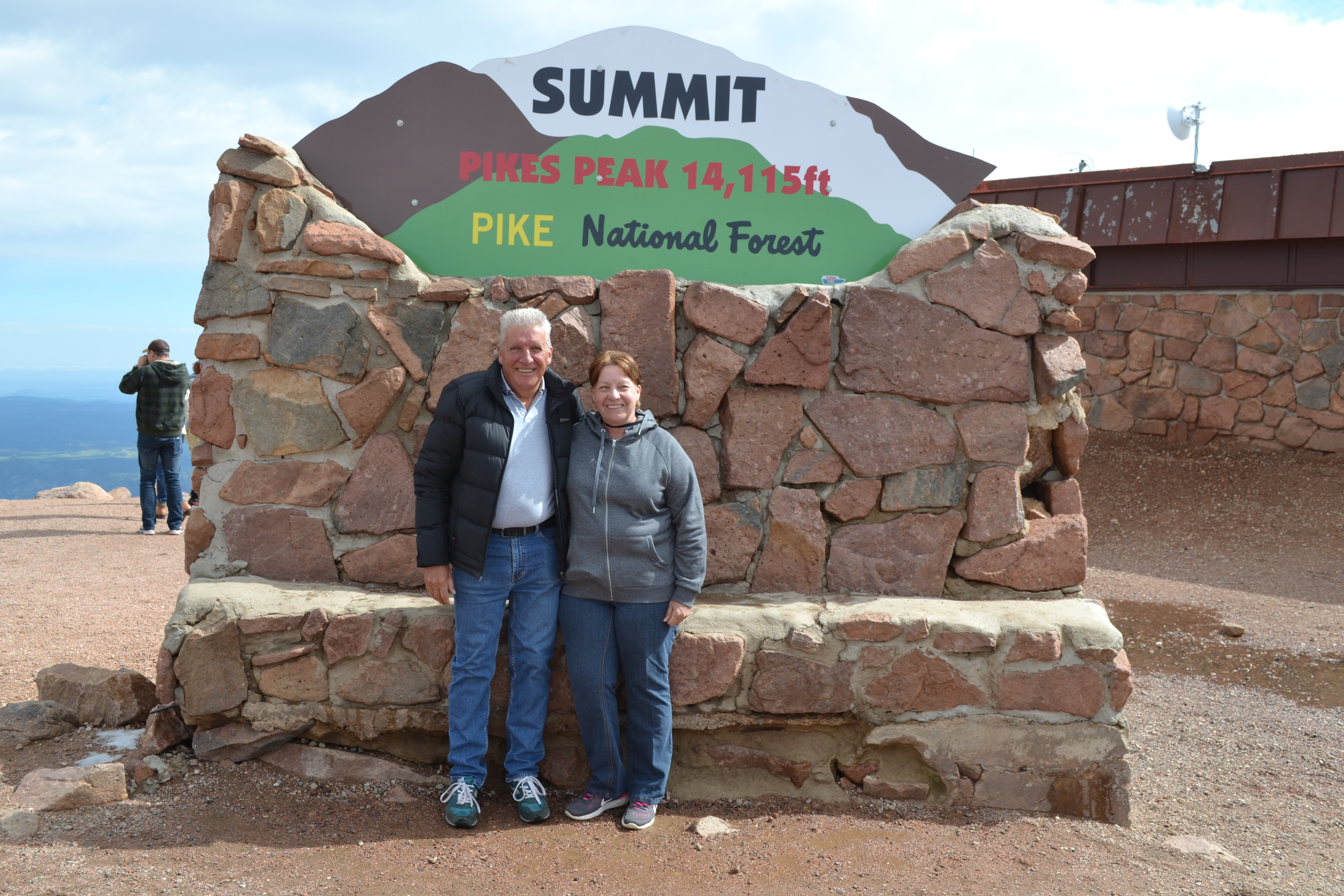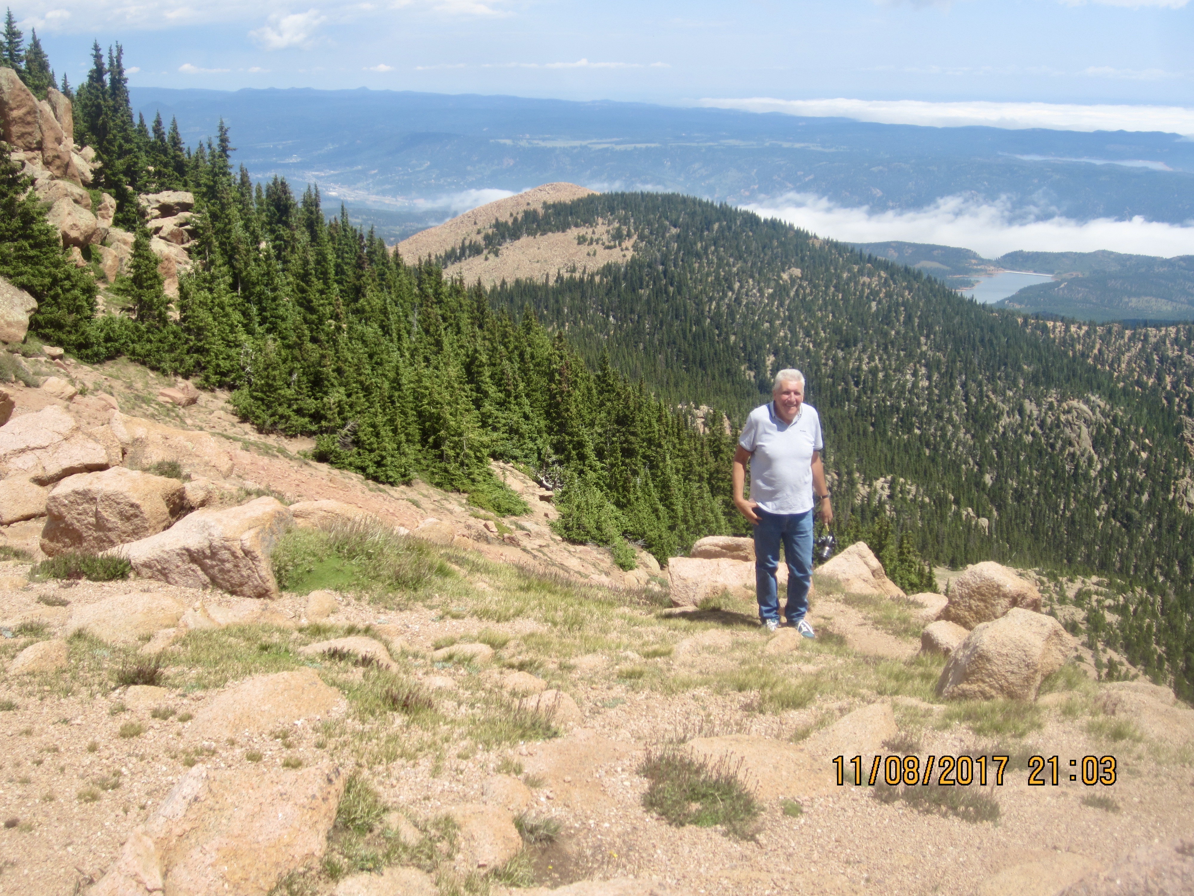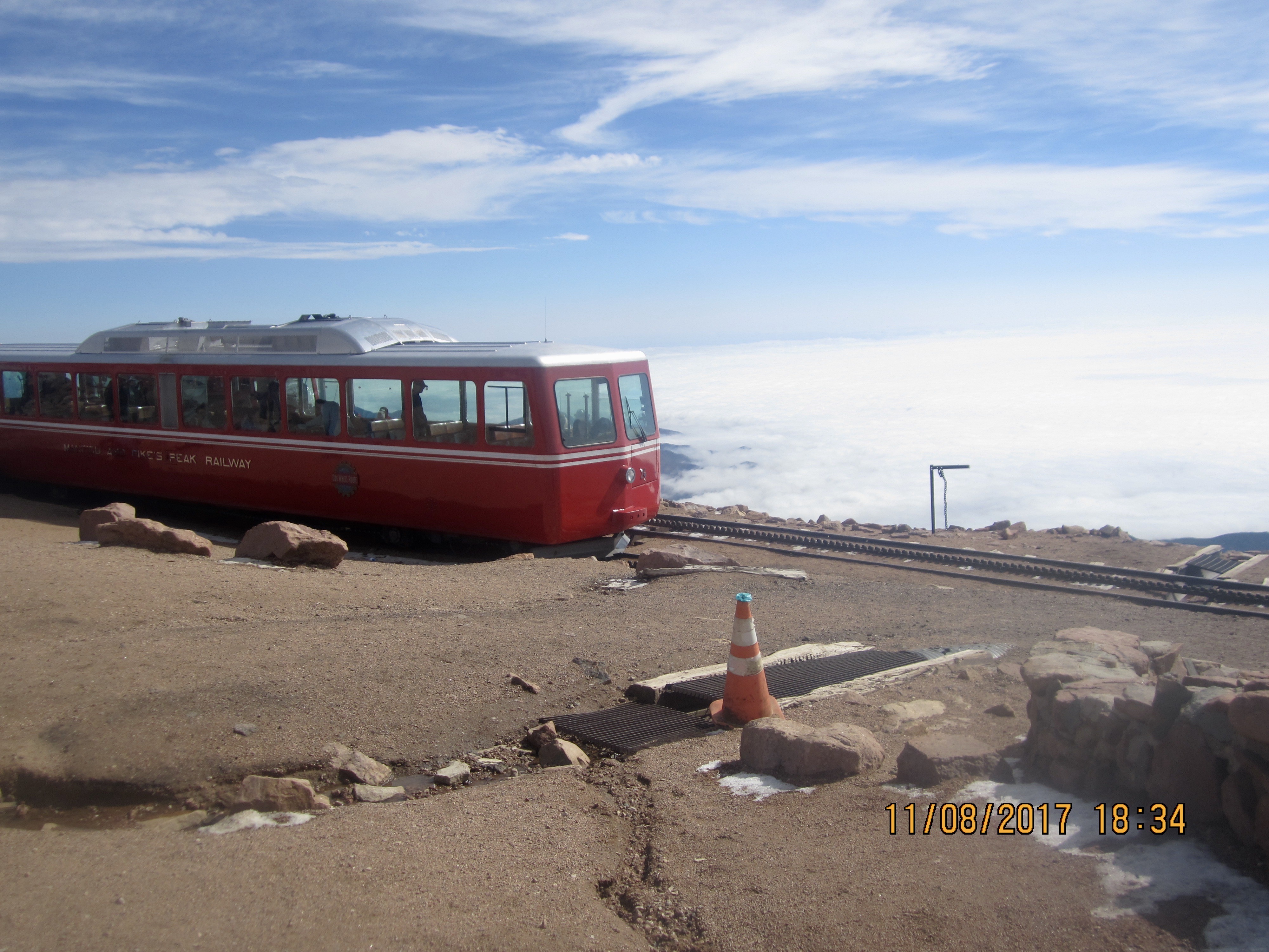 We are finally close to Manitou Springs in Colorado. The part of the trip which I have been looking forward to. The countryside is beautiful everywhere you look. The town is a picturesque tourist town with a variety of old and new shops, eating houses, parks, river walks. We are staying at a motel in the middle of town for a couple of days. The first place on our agenda was Pikes Peak. Part of the Rocky Mountain Range, Pikes Peak stands 14,115 ft above sea level. The road continuously winds through stunning tall pine trees, rocky outcrops with snowy edges and wide open mountainous hills. The road is 19 miles long, has 156 turns and climbs 6,715 ft from the entrance of the highway. Driving is a little scary with steep climbs, sharp turns and death drops on both sides. Very few guard rails and quite a bit of fast moving traffic. It is a long breath holding hour up the mountainside, but once the top is reached the fear is quickly replaced with awe. The air is clean and thin but very chilly and you need a minute or two to adjust for the altitude. Everything is picturesque. For me personally it was overwhelming, I found myself mesmerised by its beauty with a few tears wetting my cheeks. I have seen many beautiful views from very high mountains previously but the contrasting colours of the green trees, the bright blue lakes, the white snow, red rocks and blue and white skies was breathtaking. Maybe it was the combination of the scary drive and the sharp air filling my lungs I really cannot say but it is not a view I will forget easily. We spent some time walking the summit with Ken photographing from every angle. For the feint hearted or time poor there is a cog railway train that will take you to the peak. It does not stop for long but enough to take in the view and of course visit the gift shop. It happened to arrive while we were there so we were able to get a few photo’s and watch it take off on the return trip. We spent some time in the gift shop and cafe before departing for the return trip. What we found interesting just over half way down the mountain there is a compulsory pit stop where every car has to have their brakes checked for overheating. If the brakes were hot you were made to pull over and wait in the car park until they return to normal before continuing the journey. My husband expressed concern quite a few times at other drivers excessive use of their brakes on the way down so it was a very necessary safety stop and there were many cars patiently waiting.
