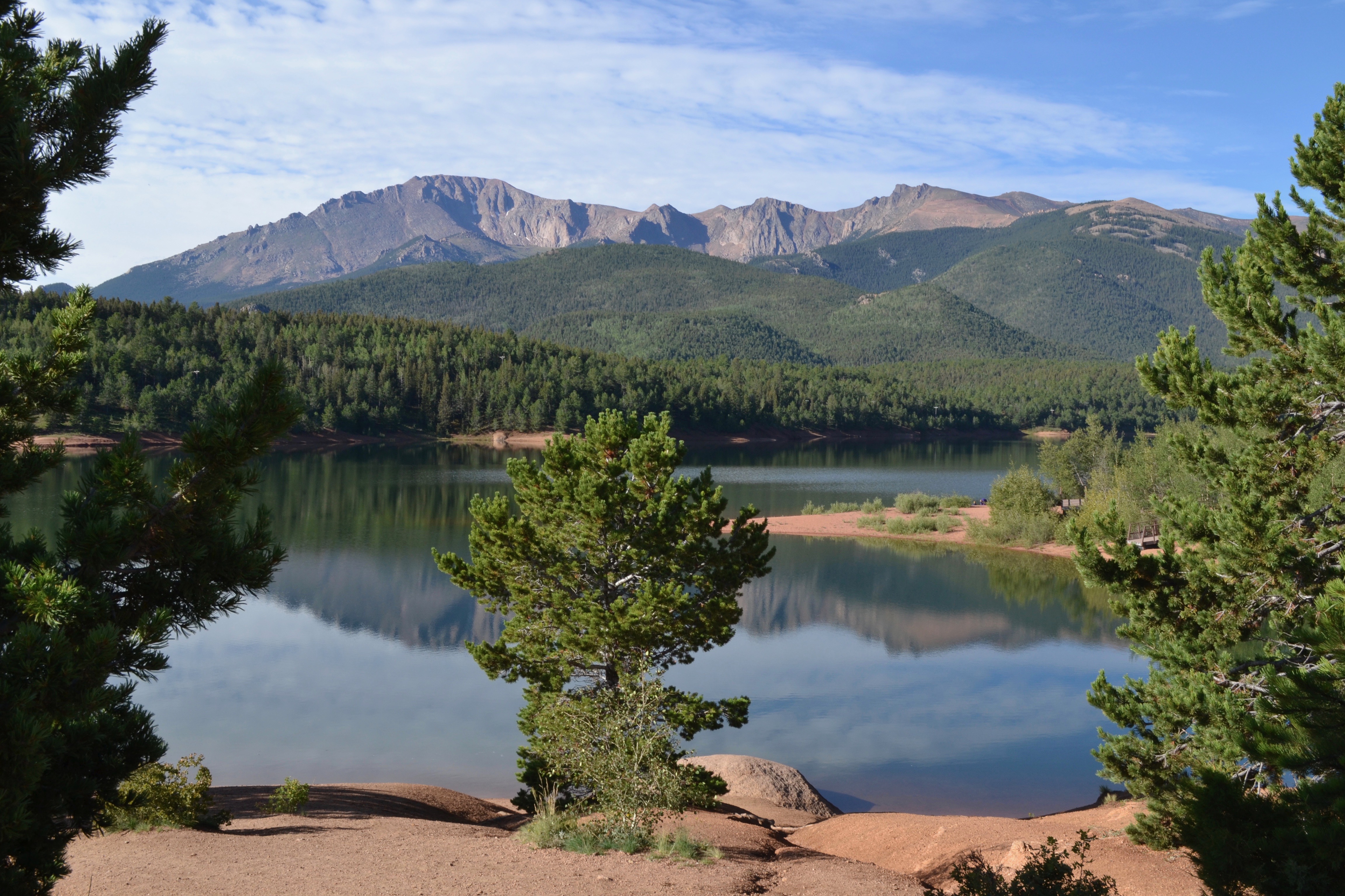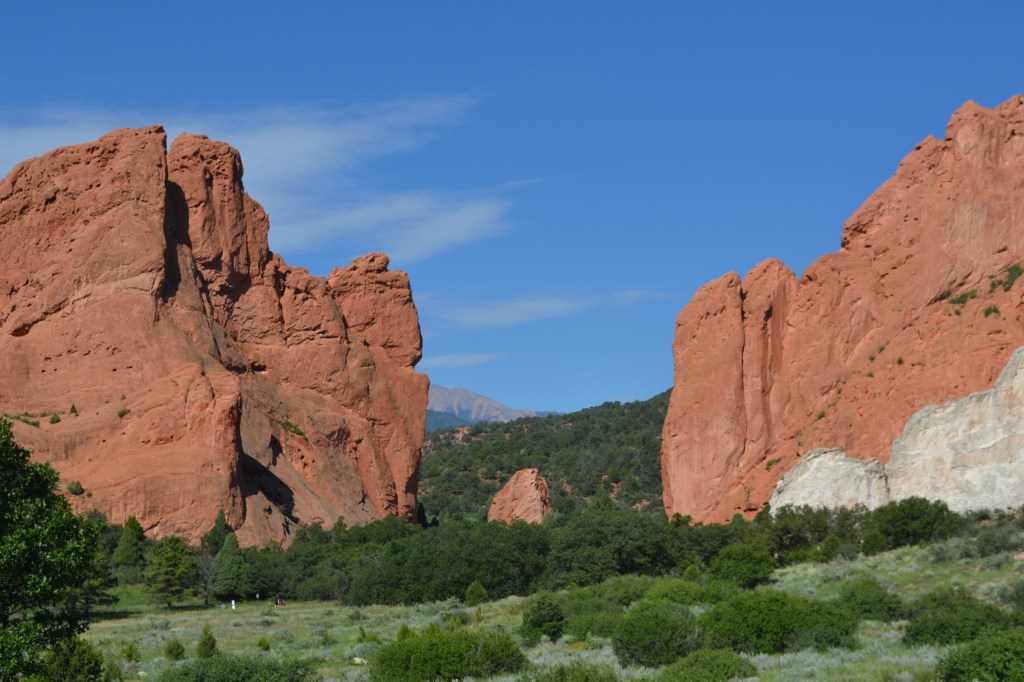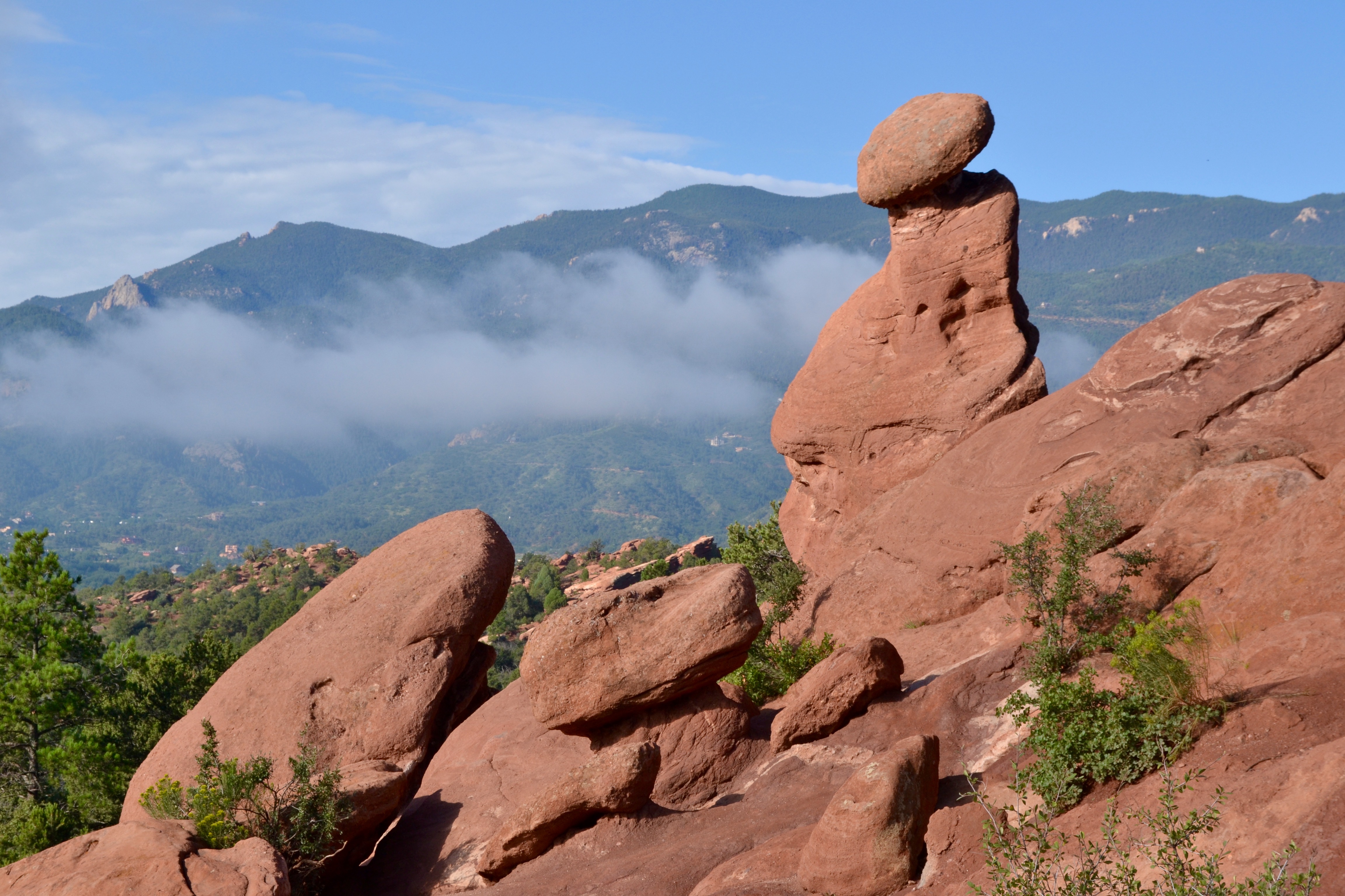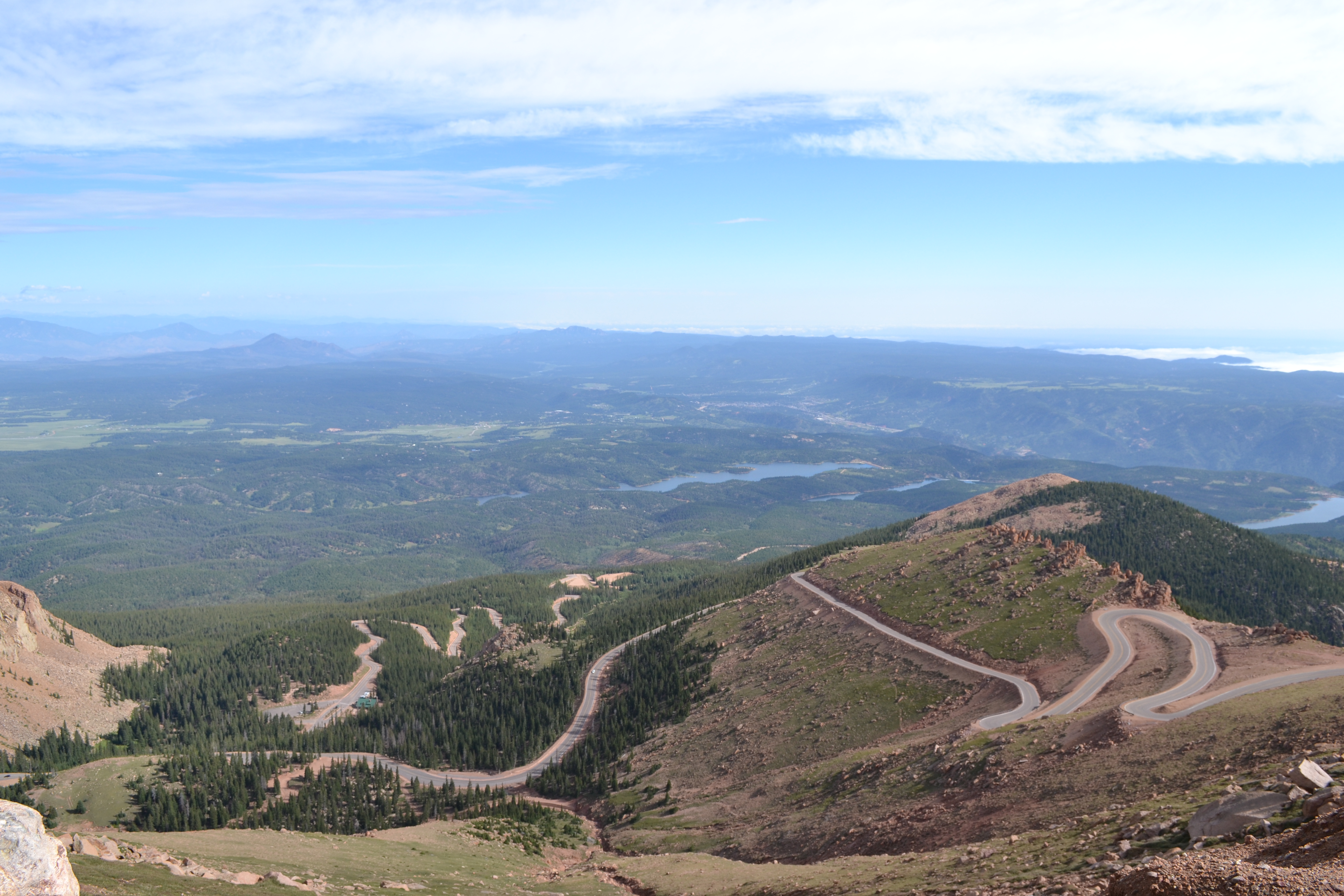 We are finally close to Manitou Springs in Colorado. The part of the trip which I have been looking forward to. The countryside is beautiful everywhere you look. The town is a picturesque tourist town with a variety of old and new shops, eating houses, parks, river walks. We are staying at a motel in the middle of town for a couple of days. The first place on our agenda was Pikes Peak. Part of the Rocky Mountain Range, Pikes Peak stands 14,115 ft above sea level. The road continuously winds through stunning tall pine trees, rocky outcrops with snowy edges and wide open mountainous hills. The road is 19 miles long, has 156 turns and climbs 6,715 ft from the entrance of the highway. Driving is a little scary with steep climbs, sharp turns and death drops on both sides. Very few guard rails and quite a bit of fast moving traffic. It is a long breath holding hour up the mountainside, but once the top is reached the fear is quickly replaced with awe. The air is clean and thin but very chilly and you need a minute or two to adjust for the altitude. Everything is picturesque. For me personally it was overwhelming, I found myself mesmerised by its beauty with a few tears wetting my cheeks. I have seen many beautiful views from very high mountains previously but the contrasting colours of the green trees, the bright blue lakes, the white snow, red rocks and blue and white skies was breathtaking. Maybe it was the combination of the scary drive and the sharp air filling my lungs I really cannot say but it is not a view I will forget easily. We spent some time walking the summit with Ken photographing from every angle. For the feint hearted or time poor there is a cog railway train that will take you to the peak. It does not stop for long but enough to take in the view and of course visit the gift shop. It happened to arrive while we were there so we were able to get a few photo’s and watch it take off on the return trip. We spent some time in the gift shop and cafe before departing for the return trip. What we found interesting just over half way down the mountain there is a compulsory pit stop where every car has to have their brakes checked for overheating. If the brakes were hot you were made to pull over and wait in the car park until they return to normal before continuing the journey. My husband expressed concern quite a few times at other drivers excessive use of their brakes on the way down so it was a very necessary safety stop and there were many cars patiently waiting.